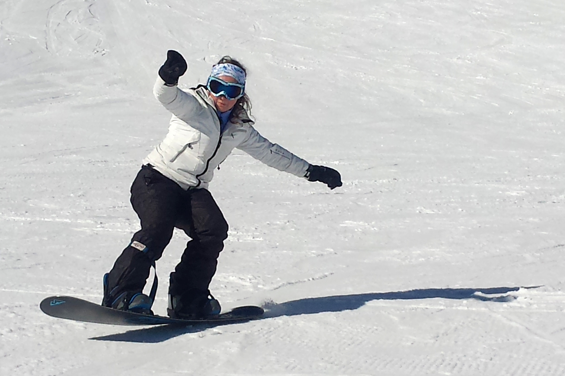 Once we’re kitted up we meet our instructor, and we familiarises ourselves with our boards. Sliding back and forth with one foot used to push against the ground, much like a skateboard. It’s maybe 30 minutes before we get on to the first baby slopes. Here we learn how to balance the board, first facing downhill balancing on our heel ends, later facing uphill balancing on our toe edges. By the afternoon we are learning how to turn the nose of the board (with our front foot – in my case goofy) downhill and come to a halt on one of the edges of the board, and thus learning the first part of a turn, but just not quite following it thought yet.